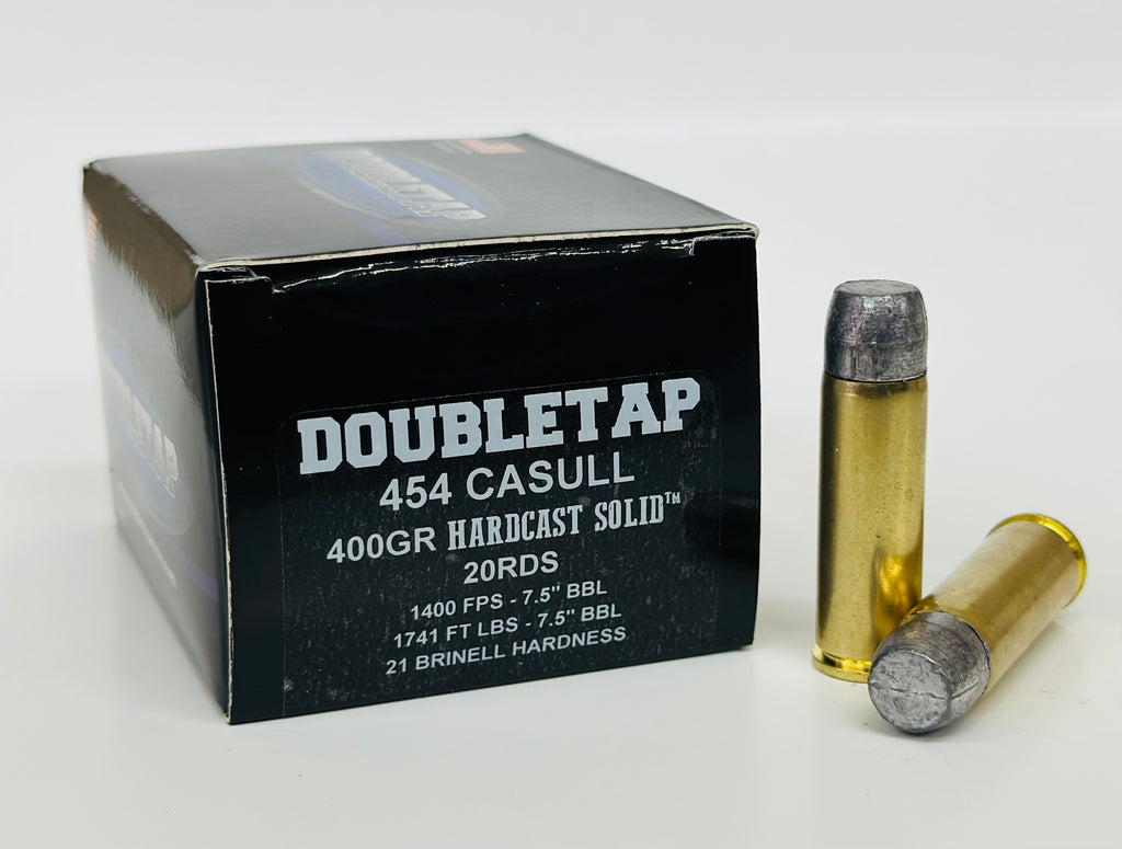 This is the real heavyweight for woods and big game including the big bears. A 400gr wide flat nose LBT-style bullet at 1400fps! Here is the deepest penetrating load that you can buy for the .454 Casull.